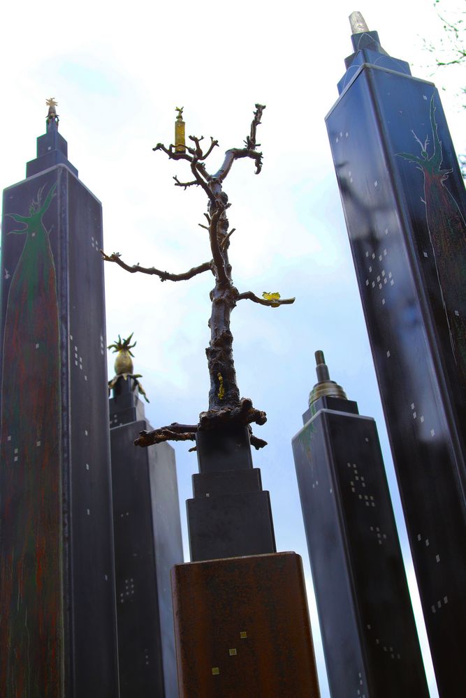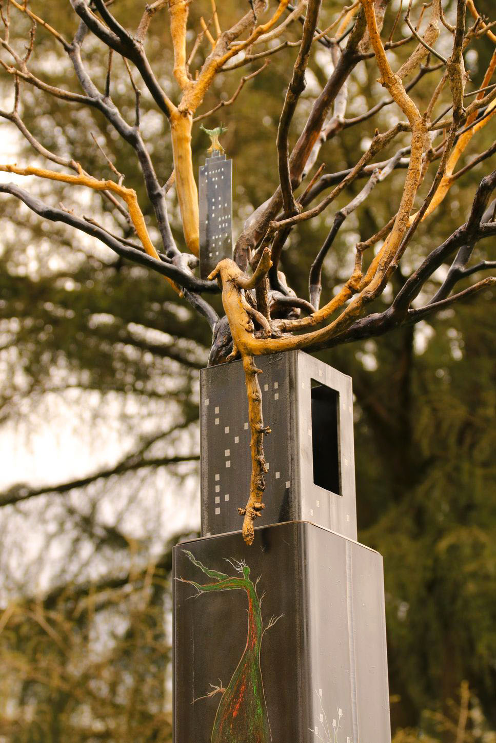 Acier gravé et patiné, bois, zinc